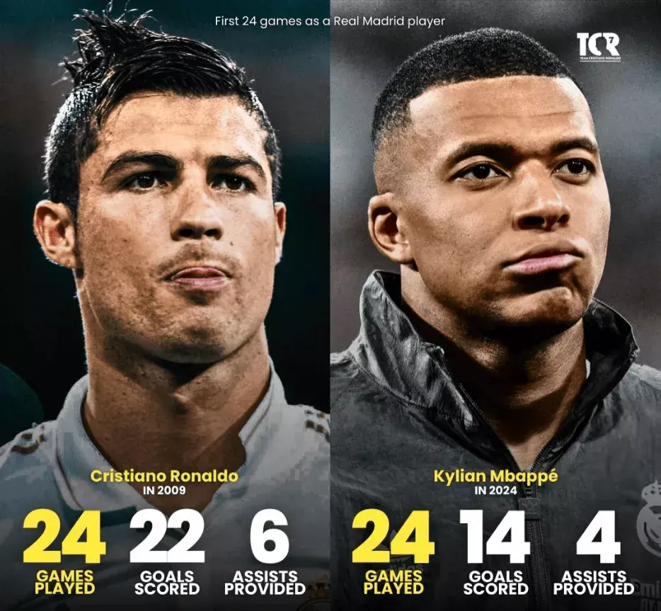 有媒体对比了C罗、姆巴佩各安静遵守皇家马德里时前24场比赛的数据,笃定如下: