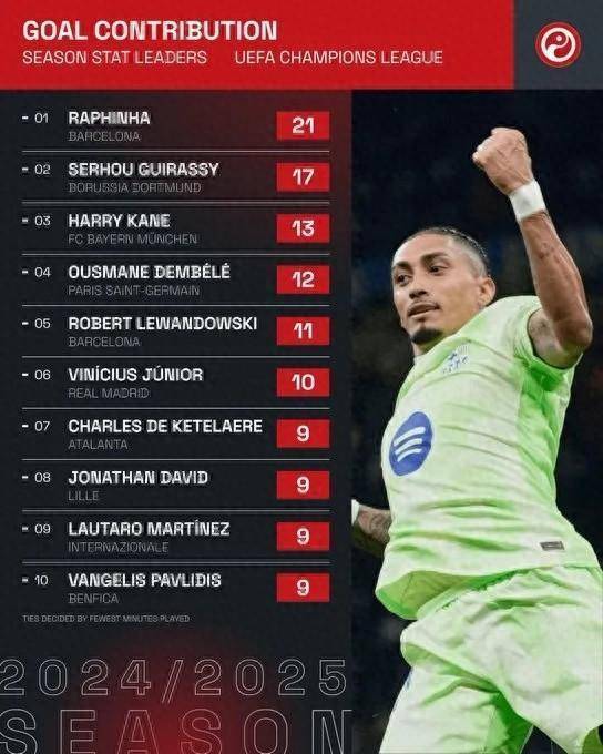 本赛季欧冠参与进球数:拉菲尼亚21球居首,凯恩13球登贝莱12球