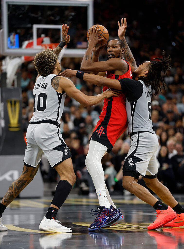 马刺也知说念火箭的高效紧要拓荒在杜兰特的手感之上,是以杜兰特一拿球就上包夹。